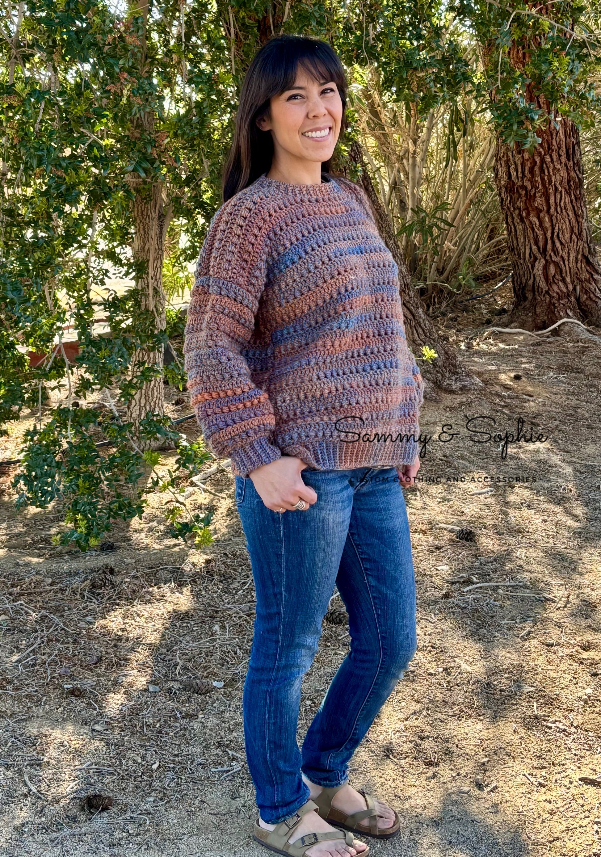 This pullover is a nice relaxed fit....perfect for weekend running around! The yarn is a beautiful blend of variegated blues and oranges for those of us who love a more understated pop of color. This particular sweater is size Petite Medium