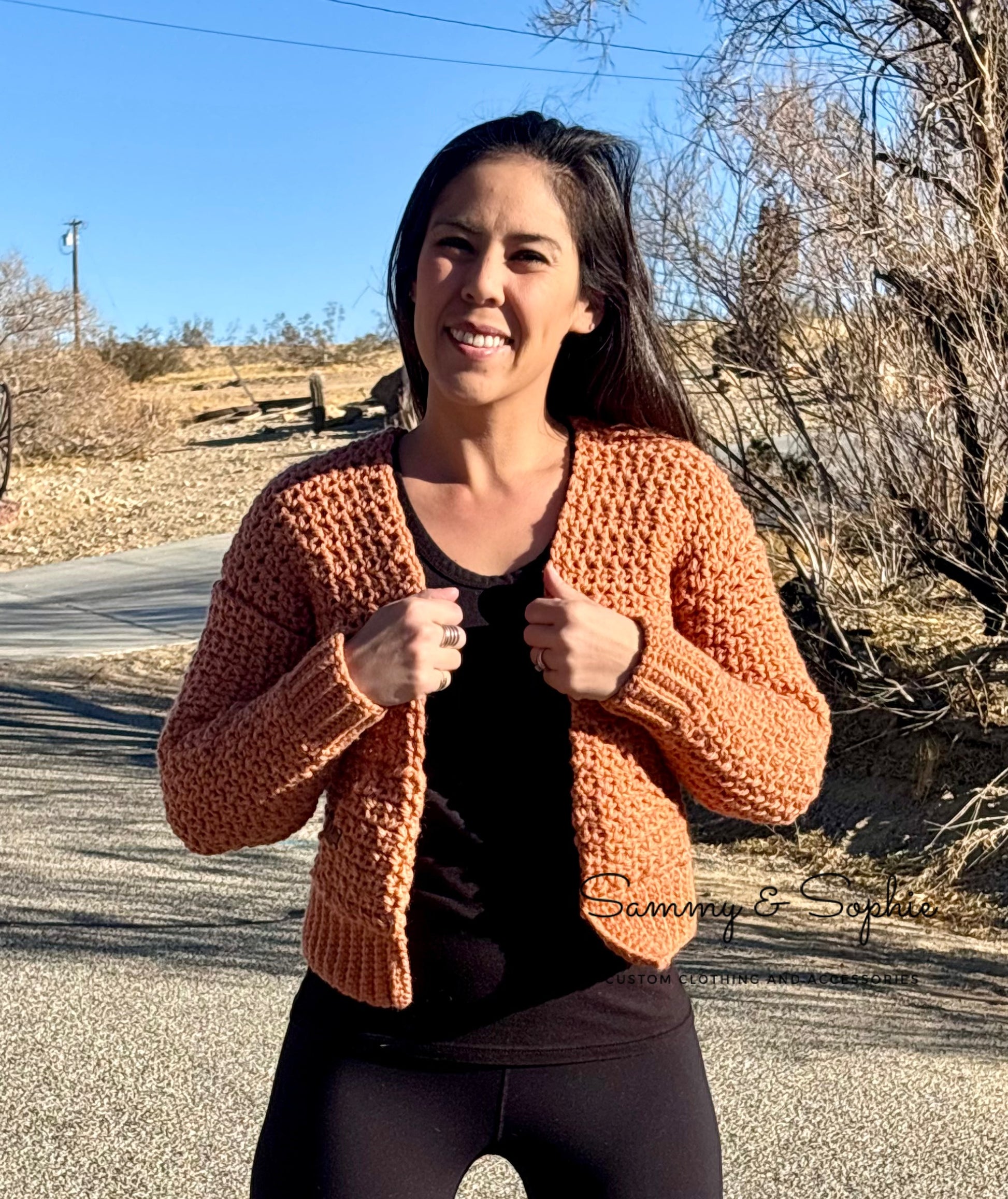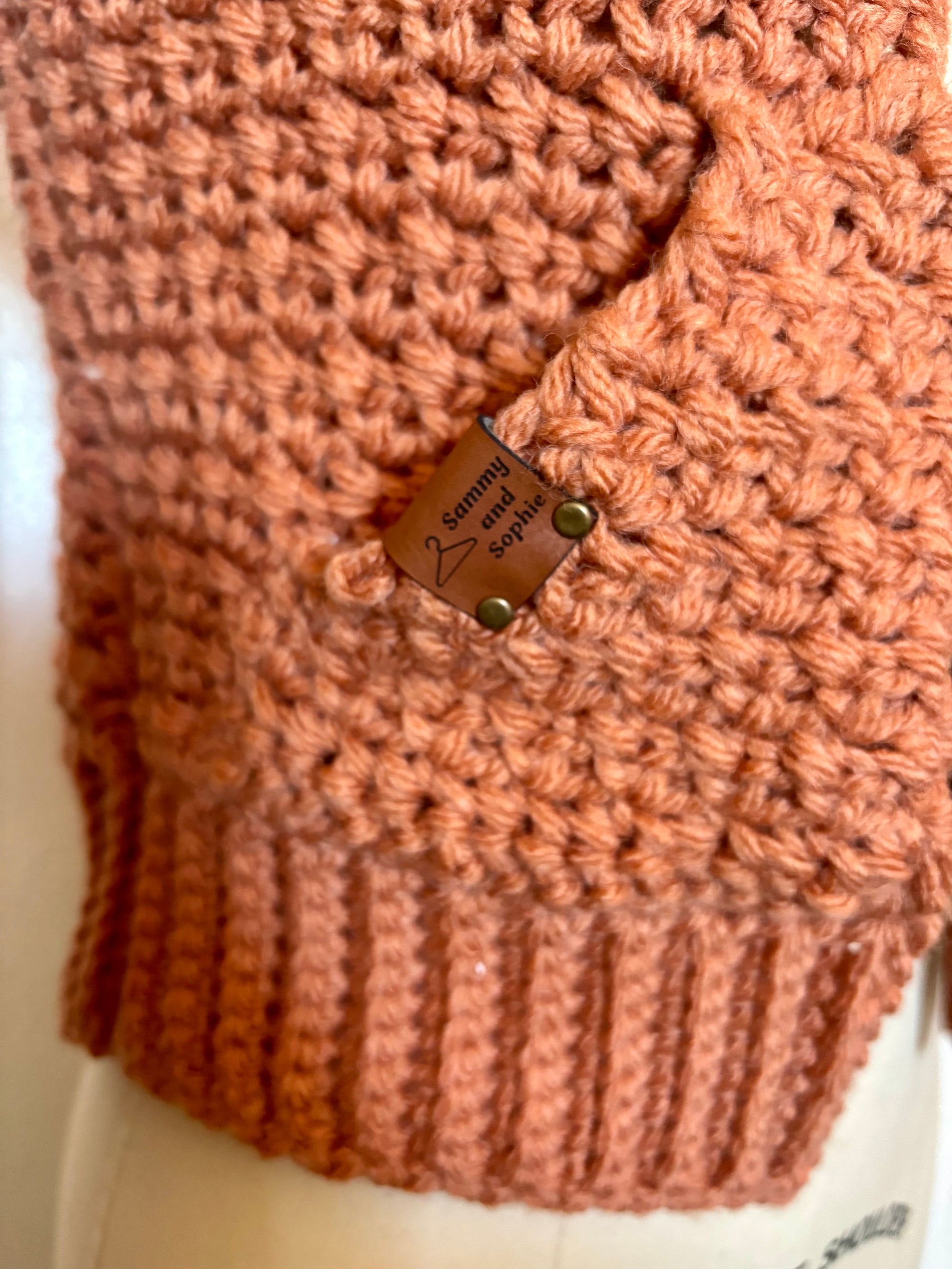 This bomber style sweater is sure to be a go-to item in your wardrobe. It has been hand-crafted with a soft rust-colored yarn and it has pockets! It is definitely not your granny's sweater. This sweater is a size small (ladies number sizing 0-4; model typically wears a ladies 4).